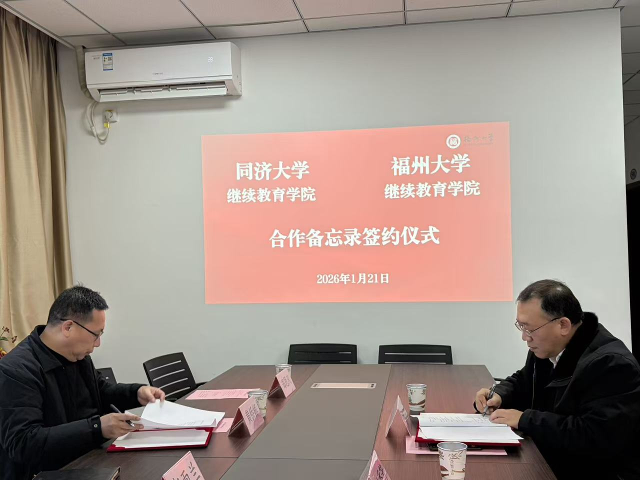 1月21日上午,福州大学继续教育学院与同济大学继续教育学院合作备忘录签约仪式在福州大学怡山校区举行。同济大学继续教育学院考书健书记、福州大学继续教育学院院长黄侨彬分别代表双方签署合作备忘录,福州大学继续教育学院副院长郑雨兰主持签约仪式。