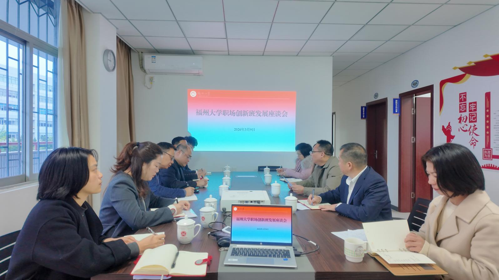 2026年3月9日上午,福州大学继续教育学院职场创新班发展座谈会在怡山校区顺利举行。会议由学院副院长陈全成主持,学院院长黄侨彬、办公室主任郑丽华、教学办老师陈敏、郭玲以及职场创新班各负责人参加会议,共同谋划职场创新班项目高质量发展路径。